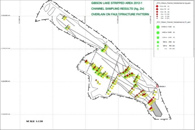 Channel line 8 returned a composite silver value of 28.0 g/t Ag over 2.05 metres, with 0.58% Pb, and 0.69% Zn. The composite included 70 g/t Ag 1.31% Pb, 1.64% Zn and 0.42% Cu over 0.6 metres.
