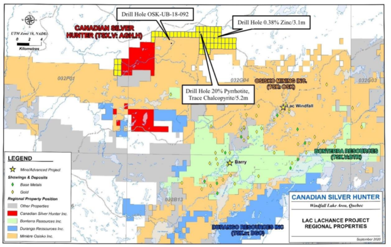 The geological conditions that hosted gold mineralization on Osisko Mining’s Windfall Lake property also exist on Canadian Silver Hunter’s northern claims.